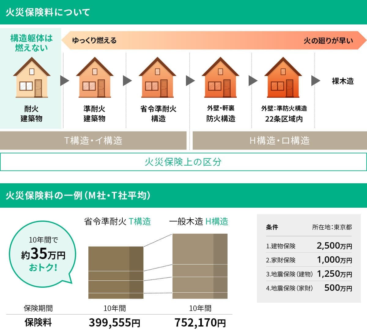 - 住宅の火災保険料については、その建築地や建物の構造方法等により、保険料率が設定されています。一般の木造軸組工法は火災保険料率構造区分では「H構造」(非耐火)となりますが、省令準耐火構造の住宅は「T構造」(耐火)の区分になります。また、地震保険にあっても火災保険の「T構造」「H構造」の区分に応じ、それぞれ「イ構造」「ロ構造」の区分になります。つまり、省令準耐火構造については、火災保険の「T構造」(耐火)の区分に該当し火災保険料率が半分程度に軽減され、さらに、地震保険についても火災保険の区分「T構造」に応じた「イ構造」が適用され、一般木造「ロ構造」に比べ軽減されます。保険料等は、保険会社によっても異なりますので、詳細は個々にご確認下さい。