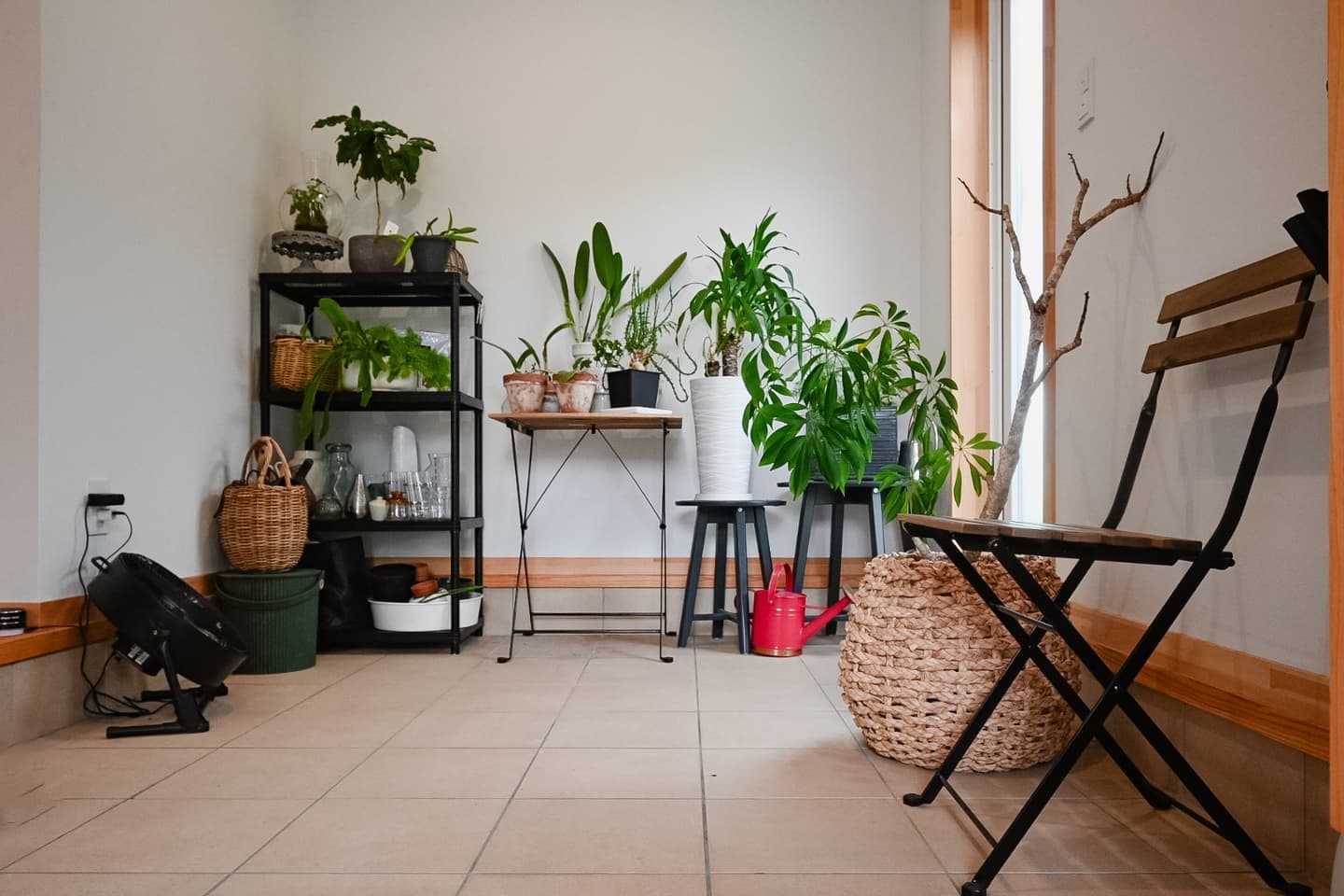 観葉植物を室内で育てやすい環境を作りました。玄関は広々と確保し、帰ってくると一番最初にグリーンたちがお出迎えしてくれます。外の植物も自分たちの手で作り上げました。芽から育てて、成長が楽しみの一つです。