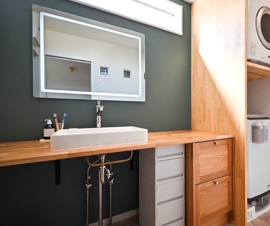 ワイドなタイプの洗面台を採用し、畳んでしまえるようにしました。
